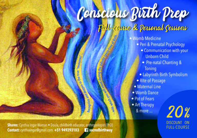 The fees for the complete course (8 one-on-one sessions) + 1 Birth Integration (after your birth, valued in $222) of US$1000 (discounted rate) for include materials, “wisebirth folder” (digital) including complete articles on Peru&birth & of birth politics and context in South America if interested (my authorship, in English published by Midwifery Today, GoodBirth Network ..) and key birth videos, and Birth Ceremony personal guidance.